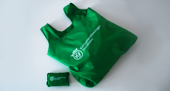 De går ofta att vika ihop så att de är lätta att ta med sig. Hela poängen med flergångskassarna är ju att det ska vara lätt att alltid ha med sig en egen kasse så att man kan säga nej tack till alla onödiga plastkassar. Därför tycker KfS att kassen i återvunnen polyester är ett riktigt bra alternativ. En nackdel är förstås att den är tillverkad av fossil råvara.