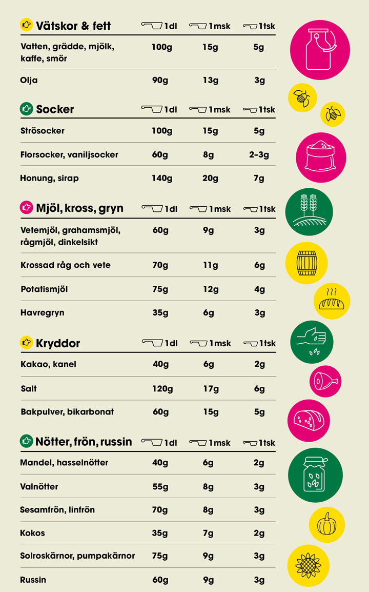 Ladda gärna ner måttomvandlaren (pdf), skriv ut och fäst på insidan av köksskåpet.